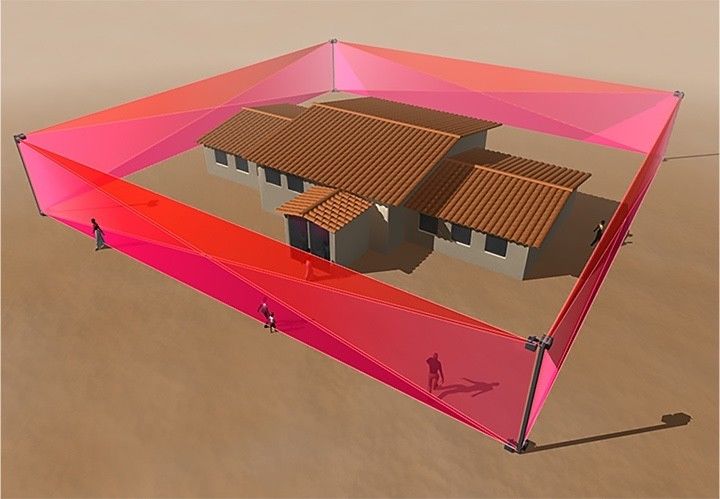 系统布置了防御围栏,它会发射一种低功率的红外线,并借助反光组件在屋子周围形成一道「光墙」,就像这样——