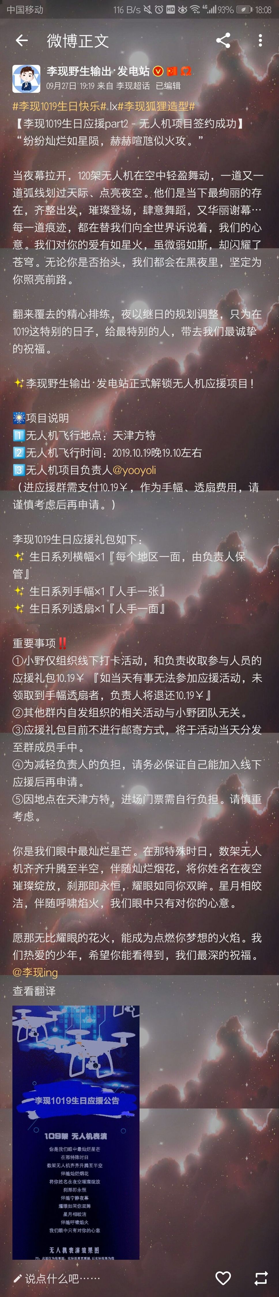 如今已到9月底,即将迎来李现10月19日的生日,于是天现宝宝们已经开始着手准备李现的生日应援。据悉,已经有天现宝宝们准备120架无人机,将于10月19日晚19:10在天津的夜空飞舞 ,为李现庆生!“九河下梢天津卫”,李现曾出演《河神》郭得友,而且李现最近在天津拍戏,天线宝宝们也太优秀了!