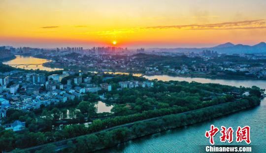无人机航拍下的赣州城区日落时分,章、贡二水汇入赣江,向北奔流,画面唯美。 吴鹏飞 摄