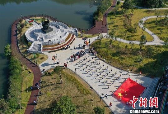 9月27日,来自江西省赣州市于都县长征源小学的70名小学生,站在于都县中央红军长征出发纪念广场上,挥舞国旗、高唱国歌。 刘占昆 摄