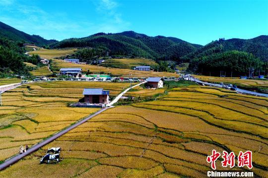图为9月28日,无人机航拍下的江西省崇义县高山梯田稻穗金黄。 王盼琛 摄