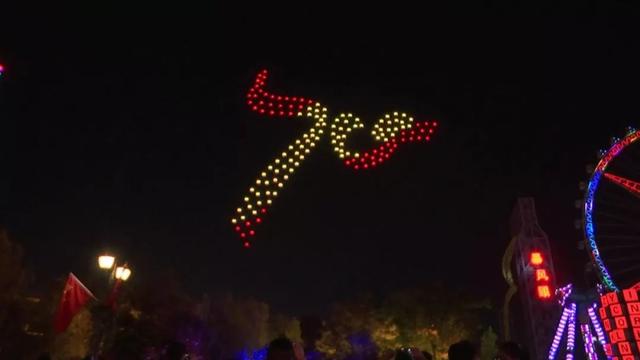 随着无人机队形的变换,在空中缓缓变幻出新中国成立七十周年的图案,并伴随着《我和我的祖国》的旋律,让现场气氛达到高潮。