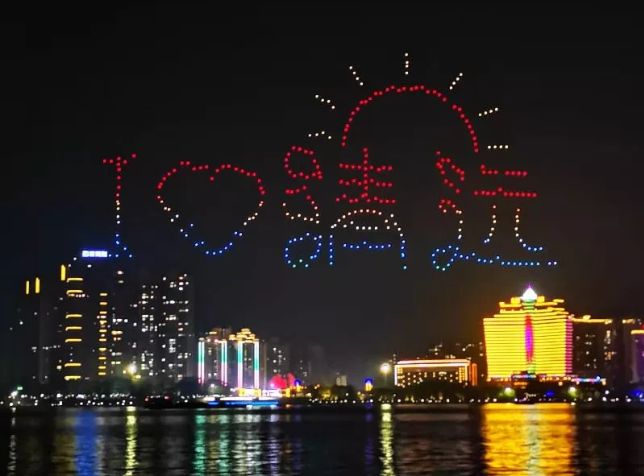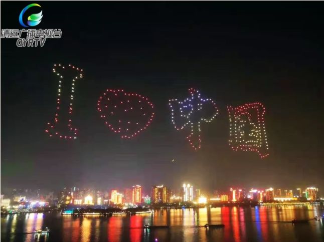 无人机编队变换出我爱中国、我爱清远等不同图案和文字