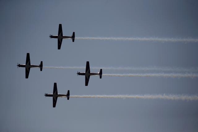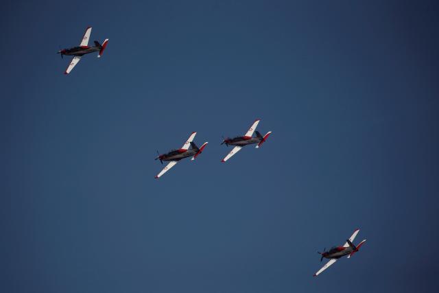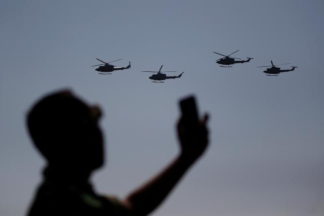 新华社照片,外代,2019年10月5日 (外代一线)(13)印尼庆祝国民军建军74周年 10月5日,在印度尼西亚雅加达,一名男子拍摄国民军建军74周年庆祝活动上的特技飞行队表演。 当日是印度尼西亚国民军建军74周年纪念日。 新华社/路透
