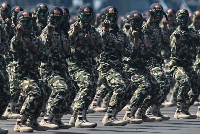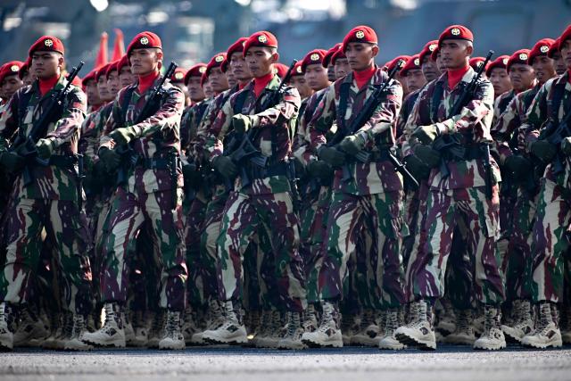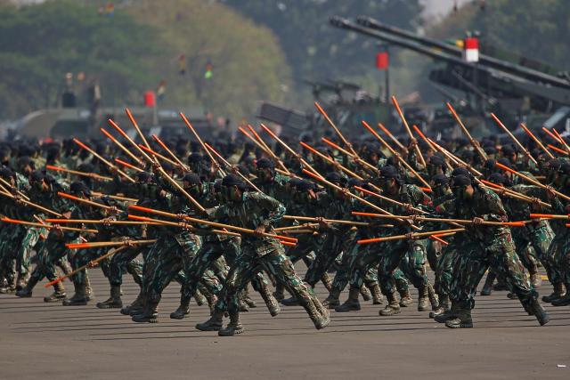 新华社照片,外代,2019年10月5日 (外代一线)(19)印尼庆祝国民军建军74周年 10月5日,在印度尼西亚雅加达,士兵在国民军建军74周年庆祝活动上表演。 当日是印度尼西亚国民军建军74周年纪念日。 新华社/法新