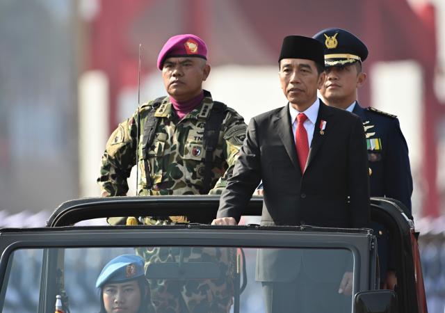 新华社照片,外代,2019年10月5日 (外代一线)(17)印尼庆祝国民军建军74周年 10月5日,在印度尼西亚雅加达,印尼总统佐科(前)在国民军建军74周年庆祝活动上检阅士兵。 当日是印度尼西亚国民军建军74周年纪念日。 新华社/法新
