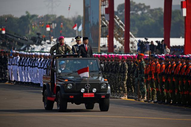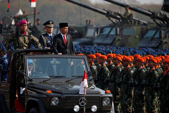 新华社照片,外代,2019年10月5日 (外代一线)(15)印尼庆祝国民军建军74周年 10月5日,在印度尼西亚雅加达,印尼总统佐科(中)在国民军建军74周年庆祝活动上检阅士兵。 当日是印度尼西亚国民军建军74周年纪念日。 新华社/路透