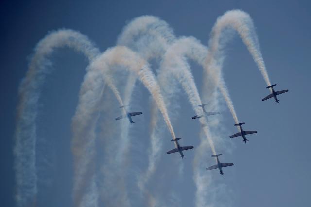 新华社照片,外代,2019年10月5日 (外代一线)(6)印尼庆祝国民军建军74周年 10月5日,在印度尼西亚雅加达,特技飞行队在国民军建军74周年庆祝活动上表演。 当日是印度尼西亚国民军建军74周年纪念日。 新华社/路透