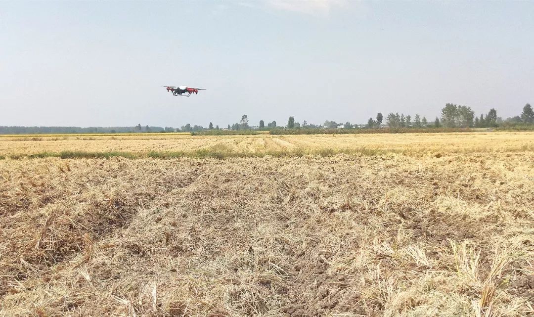 上午9时许,随着田地耕整完成,早已调试好的无人机迅速升空,不到10分钟,7亩田地就已播撒完毕,无人机快速地返回起飞点,平稳降落。