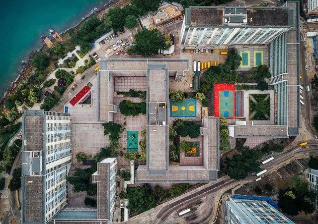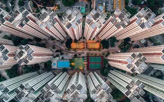 香港九龙,曾经是世界人口密度最高的地方,90年代大拆迁,旧城改造,建筑向空中延伸,摄影师航拍这些密集的建筑物,这种封闭的蜗居,窗户是人们接触外界空气的唯一途径。