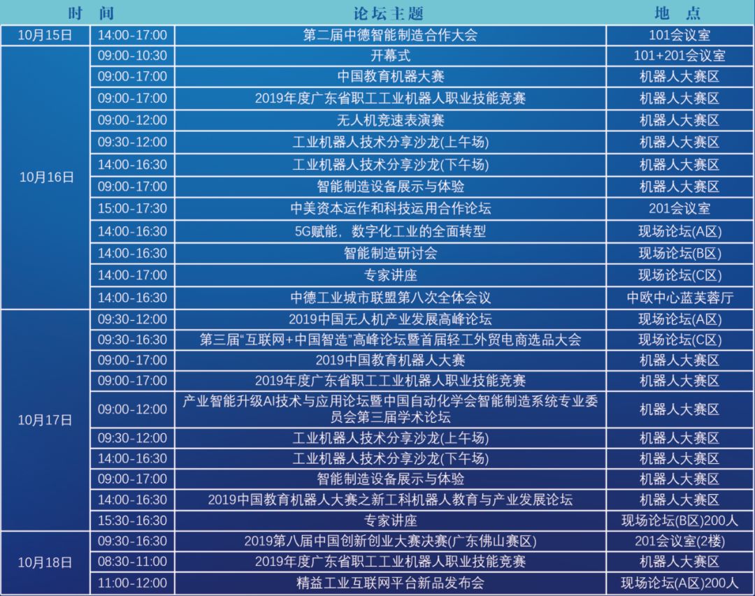 为提升博览会品牌影响力与专业度,展会同期将举办25场专业论坛与高峰赛事,包括:第二届中德智能制造合作大会、2019中国教育机器人大赛、2019年度广东省职工工业机器人职业技能竞赛、无人机竞速表演赛、第三届“互联网+中国智造”高峰论坛暨首届轻工外贸电商选品大会、智能制造研讨会等。