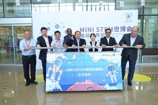 参加普惠上海发动机中心举办的“迷你STEM”世博会活动的与会嘉宾共同启动上海青少年STEM航空孵化器项目。左起:上海市航空学会秘书长金鸿明;中国东方航空股份有限公司副总经理兼东方航空技术有限公司总经理冯亮;上海市航空学会常务理事、科普工作委员会主任、上海工程技术大学原副校长陈力华;普惠公司GTF发动机运营与工业管理副总裁罗伯特·格瑞菲斯(Robert Griffiths);联合技术公司亚太区政府关系高级副总裁谢丽平;中国友好和平发展基金会STEM 项目负责人李嘉莹;普惠公司商用发动机大中国区客户业务总裁范佑勋(Yogesh Farswani);普惠公司售后运营副总裁乔·斯维司特罗(Joe Sylvestro)。