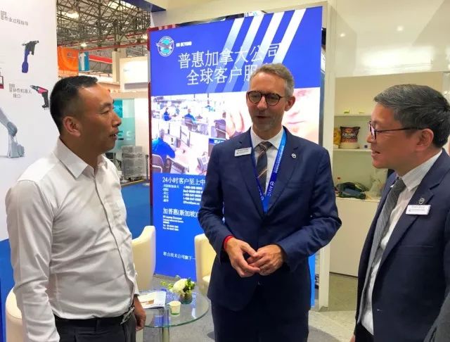 普惠加拿大公司直升机发动机市场营销与销售副总裁在普惠展台上接待来访客户。左起:中信海洋直升机股份有限公司(中信海直)副总裁刘建新、普惠加拿大公司直升机发动机市场营销与销售副总裁倪凯乐(Nicolas Chabee)、普惠加拿大公司涡轴运营商市场营销区域经理郑建聪。