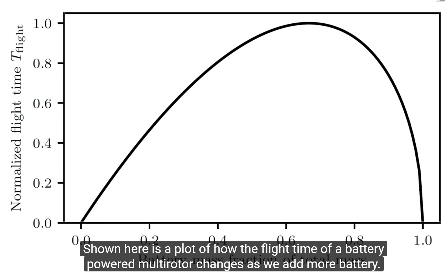 我们看到,相对于我们添加的电池,飞行时间有一个基本的上限。当电池电量为全部质量的三分之二时,我们根据该上限标准化飞行时间,我们的主要四轴飞行器在此时运行,相应的飞行时间为12分钟,此时重0.82千克。使用该图可得出主要四轴飞行器的最大可飞行时间为26分钟,这是质量将达到1.89千克,这会使飞机更重且增加安全风险。