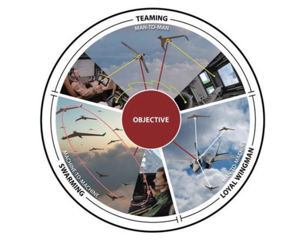 由于无人机对战场态势的感知与实时决策能力还不能完全替代人的思维与判断,尚难以满足复杂战争中对无人机高层次自主和智能的要求。因此,采取无人机与有人机共融集群,实现能力互补和行动协调,已成为重要发展趋势。无人机可充分利用其机动能力强、成本低、隐身性能好的优势,在恶劣条件下执行危险任务,消除有人机执行任务的风险;有人机可充分利用人的智慧和综合判断能力,排除干扰,实现共融集群的综合决策和任务管理。2010年4月,美军发布的《美国陆军无人机系统2010—2035路线图》明确把无人机发展划分为3个关键阶段,提出通过通用互操作标准实现无人机系统的一体化,从而为实现高层次人机融合奠定基础。2016年5月,美国空军发布的《小型无人机系统飞行规划2016—2036》对“忠诚僚机”集群作战概念进行了阐述,强调无人机与有人机的共融作战,旨在通过无人机与有人机联合编队加强双方作战能力。2018年8月,美国国防部发布的《无人系统综合路线图2017—2042》强调应注重互操作性技术发展以助力有人/为无人系统的高度协同。在中国国务院2017年7月发布的《新一代人工智能发展规划》中,8次提到了“人机协同”,并把“人机协同共融”作为建立新一代人工智能关键共性技术体系的重点任务之一。在2018国家机器人发展论坛暨RoboCup机器人世界杯中国赛开幕式上,中国工程院院士王天然指出“下一代机器人将‘与人共融’,如果能抓住这个机遇,中国将在机器人创新舞台上扮演一个特殊的角色”。在2018 IEEE/CSAA制导、导航与控制学术会议(IEEE/CSAA GNCC2018)上,中国工程院院士樊邦奎提出“无人机系统与有人系统之间的高度协同是实现无人机集群实际应用的关键”。因此,在未来信息化、网络化、体系对抗的环境下,采取无人机与有人机共融集群,通过密切协同和高度智能的人机交互来完成信息获取、任务决策、指挥引导复杂人机协同,达成操作员与无人机不同维度间的互联互通互操作,可实现跨域平台系统任务能力的倍增甚至指增效益。