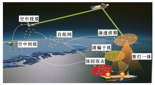 2)诱骗干扰:采用无人机集群充当诱饵或干扰机,替代隐身轰炸机或战斗机直接进入战场的传统作战方式,可引诱敌方防空探测设备开机工作从而暴露阵位,消耗敌方防空兵器;此外,可携带电子干扰设备,对敌方预警雷达、制导武器等进行更加抵近的电子干扰压制欺骗。