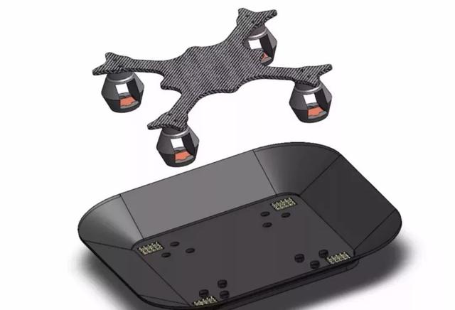 实验中用到了两架无人机,一架主飞机,另外配有一块电池的小型四旋翼无人机携带为主飞机供电的电池。对接机构是机械引导结构,其形式为对接平台,安装在主四轴飞行器上,对接支腿连接至小型四轴飞行器。