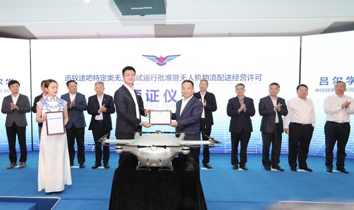 10月15日,中国民航局副局长吕尔学向杭州迅蚁公司所属的杭州送吧物流科技有限公司CEO章磊颁发了《特定类无人机试运行批准函》和《无人机物流配送经营许可》。