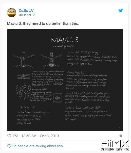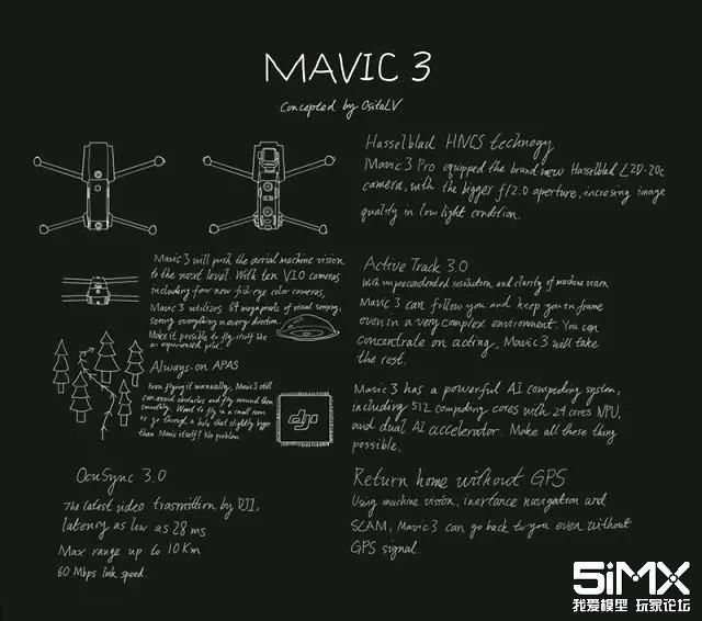 号称灵魂画手的OsitaLV画出了Mavic3最新的参数规格猜想,无GPS信号信号的智能返航应该是最大的两点了。