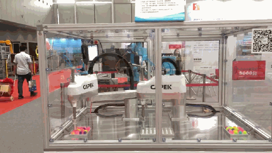 下图正快速工作中的机器人来自佛山隆深机器人有限公司展位。该机器人支持双搬运工作,可同工位协同自由抓取,犹如“一个大脑,两个身体”。