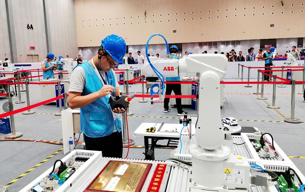 广东省职工工业机器人职业技能竞赛首场比赛今日上午正式打响,机器人正在装配工艺字。