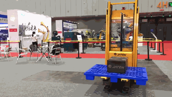 在嘉腾机器人展位,两台机器人在搬运物件。这类搬运机器人可精确定位,适用于物流、仓储等。