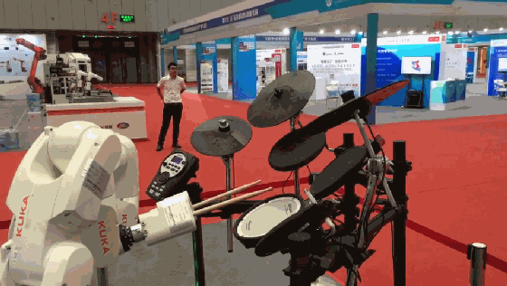 同样由佛山隆深机器人有限公司带来的还有一台德国库卡机器人。该机器人可随着音乐打拍子、敲鼓点。