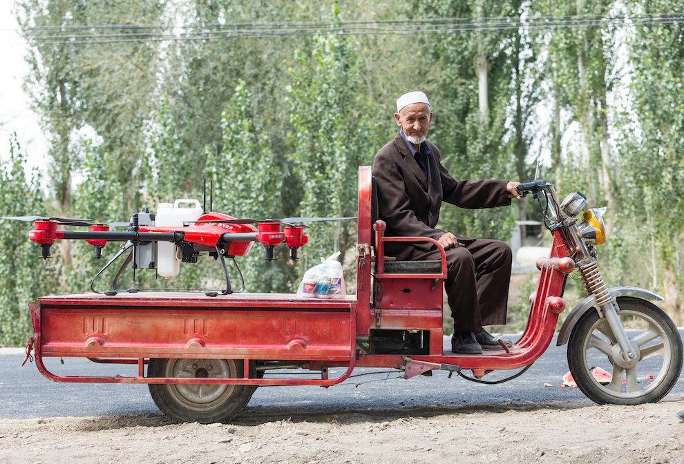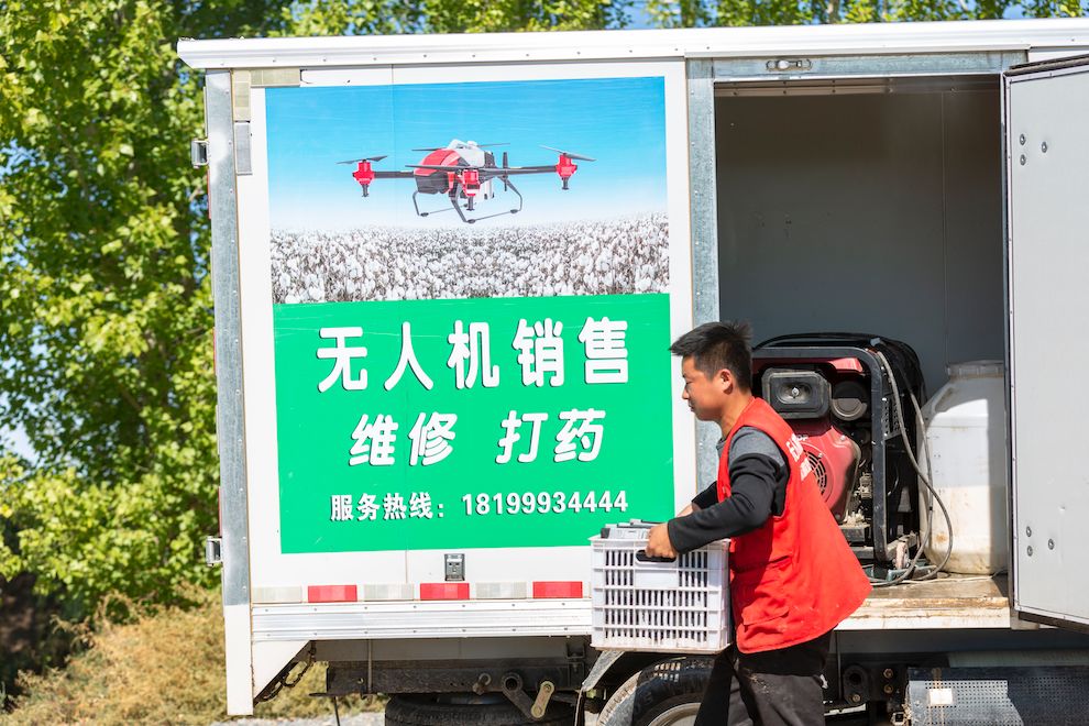 如今,在新疆已经很难再见采棉大军的身影,取而代之的是开着一辆辆酷炫的改装车、顶上载着显眼红飞机的精英植保队伍。