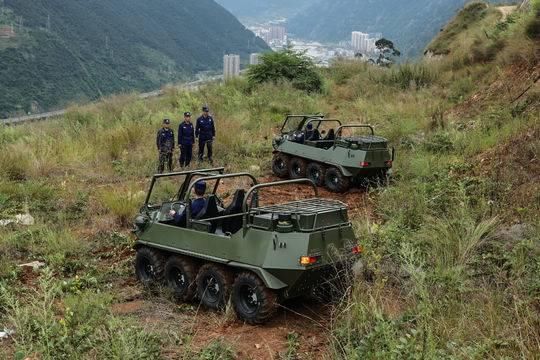其中,为应对复杂地形,山猫全地形车加入驻训。这种新型全地形车采用八轮式驱动,承载重量大,爬坡能力强、适用地域广等特点,可适应于沙滩、雪地、河床、林道、山地等地形,更加有利于急难险重任务。
