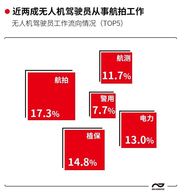 如果你对无人机驾驶员的印象还停留在“不过操纵一下玩具飞机,最多用来拍拍照”,可就大错特错了。统计数据显示,无人机驾驶员主要工作去向排名前五的分别是航拍、植保、电力、航测与警用。《无人机驾驶员就业景气现状分析报告》中也提到,未来我国无人机主要领域包括影视航拍、农林植保、电力巡检、安防应急与航空测绘,这与目前无人机驾驶员主要工作去向基本吻合。