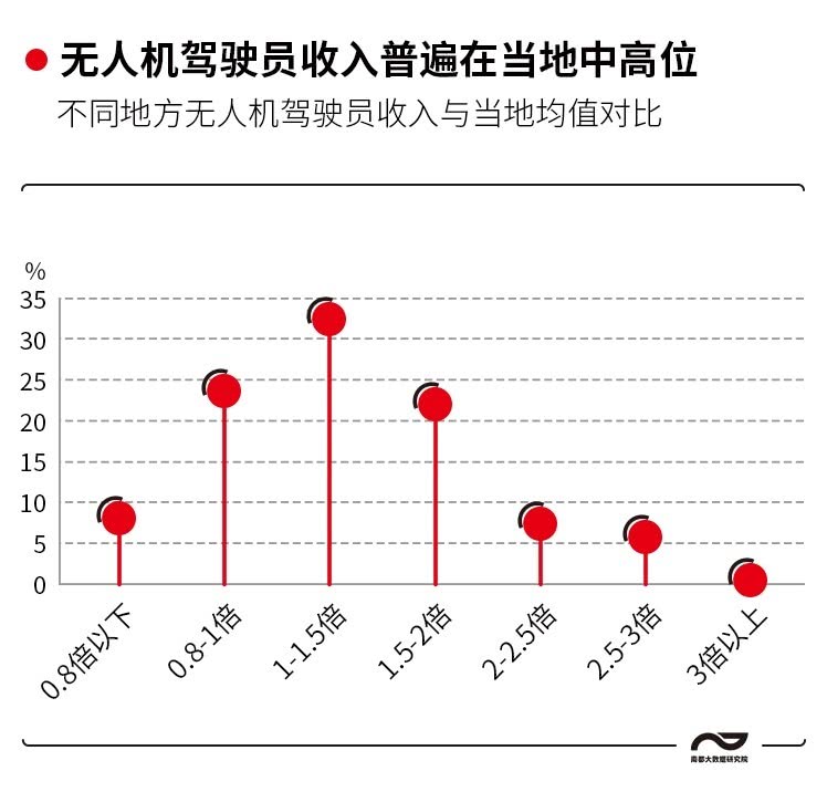 无人机驾驶员不仅需求量大,而且薪酬也很可观。报告显示,约68%无人机驾驶员收入持平或高于当地平均收入水平。收入水平达到或高于当地平均收入水平2倍以上的占13%,极少数无人机驾驶员的收入可达到当地平均水平的3倍以上,大部分无人机驾驶员的收入为当地平均水平的1-2倍之间。国家统计局数据显示,2018年北京、上海居民人均可支配收入一年在6万元以上。换句话说,在一线城市当无人机驾驶员,大部分能在这个可支配收入以上,少部分可支配收入甚至可以达18万以上。