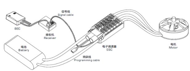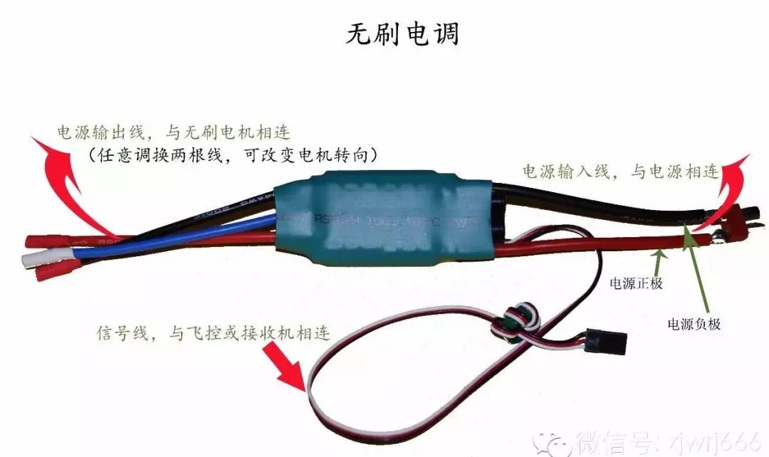无刷刷电机由于取消了碳刷结构,需要能替代碳功能的部件,这个就是电调,电调负责将直流电,转换为三相电,并根据需要控制其电压电流大小,从而驱动无刷电机实现需要的转速输出。在确定电机型号后,根据电机的最大电流,再选择合适的电调。[]具体地,电调的输出电流必须大于电机的最大电流,而且是越大越好。例如,所选择的电机带桨的最大负载电流是50A,那么电调的最大电流必须是60A,或者80A,电调电流越大,越不容易烧毁。