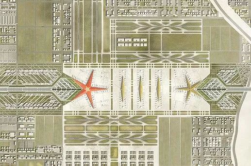 从总平面图上看,机场具有完美几何构成,除了一座大型航站楼,还有一座稍小的,以及三座卫星厅。