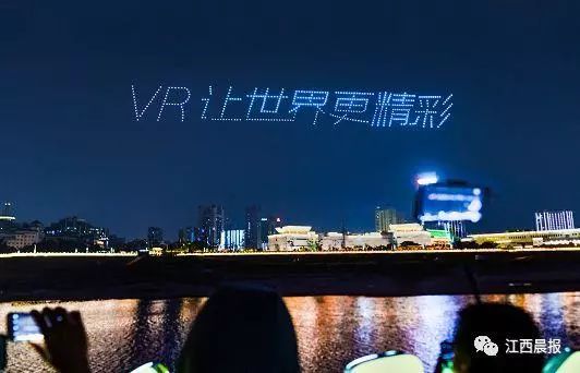 紧接着,“我爱江西”“VR+5G开启感知新时代”“VR让世界更精彩”等元素在无人机的不断变换中逐渐呈现,为城市增添一道亮丽的夜景,充分彰显新时代南昌的城市风采。