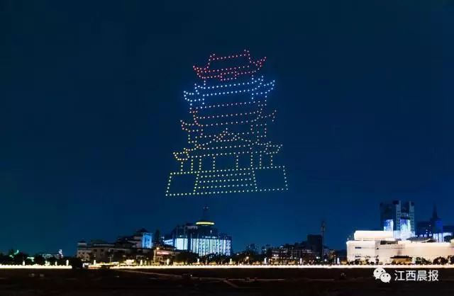 表演当晚,无人机光影秀以城为景以夜空为幕,500架无人机不断变换灯光图形飞向夜空,如萤火虫般漫天飞舞,逐渐组成“八一大桥”“崛起雕塑”“滕王阁”等南昌特有元素画面。