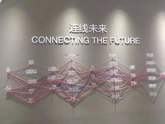 在创新设计体验馆,最初的体验与“线条”有关。入馆第一眼便能看见墙壁上勾连着70根红线,寓意中华人民共和国成立70周年。你可以动手操作未来议题连线游戏:连接几条线,便能绘制属于自己的关于未来生活的“未来议题”,在探索中寻找藏在自己内心深处关于未来生活的答案。