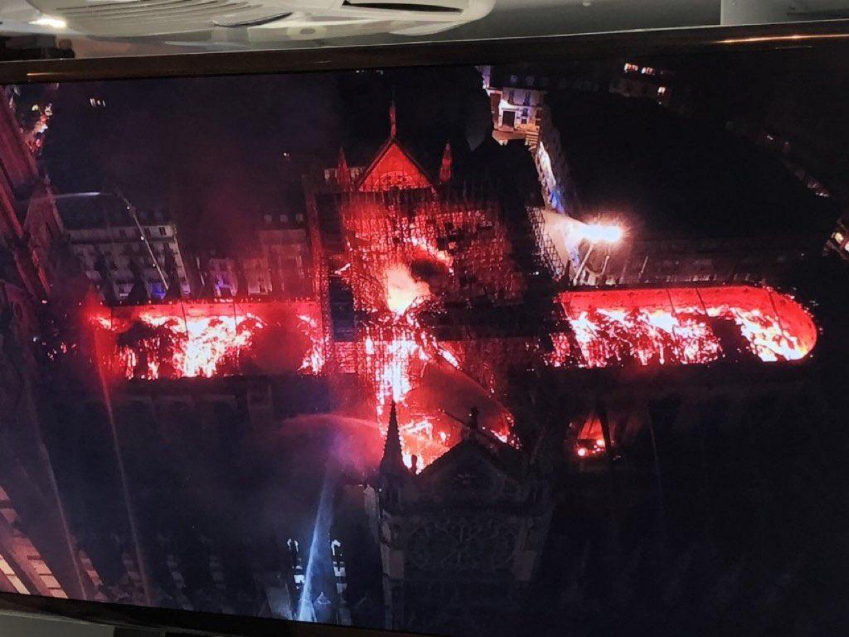 中国无人机拍摄到的巴黎圣母院失火照片