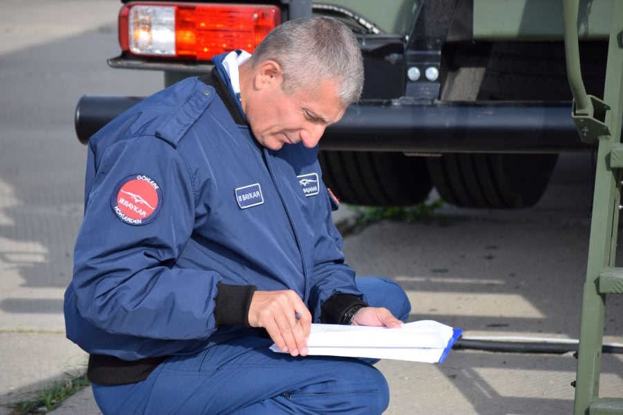 土耳其人员协助乌克兰军方测试TB2察打一体无人机的画面