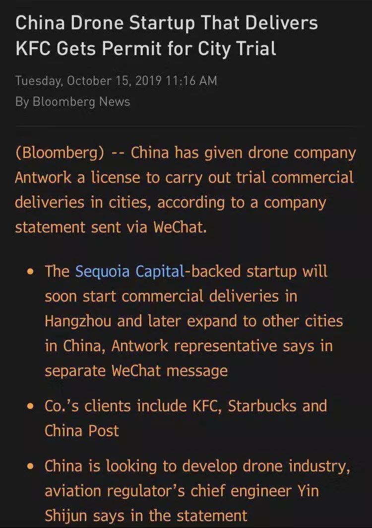 继上周迅蚁送吧获民航局颁发全球首张城市物流无人机试运行“牌照”之后,不但吸引到了国内各类媒体和创投界的持续报道,全球顶级媒体美联社、雅虎、彭博社等多家外媒也关注到了迅蚁这颗科技界的新星。