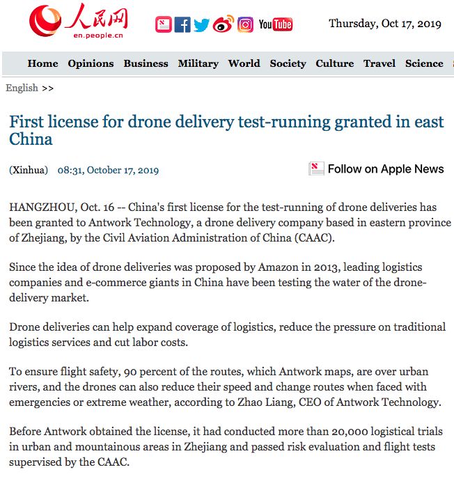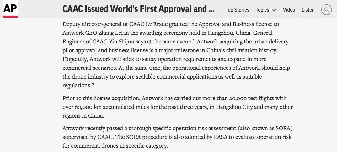 美联社在上周发表了题为《中国民航局向迅蚁颁发世界首张商用无人机城市运行许可证》(CAAC Issued World’s First Approval and Business License to Antwork for Operating Commercial Drone Deliveries in Urban Areas)的专题报道,并同时引发了雅虎新闻、每日先驱日报、欧洲邮政公报等上百余家外媒的争相报道。