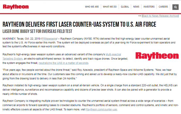 早在2018年3月,雷神公司就宣布其反无人机技术已在一次陆军演习中成功击落了数十架无人机和其他无人机系统,包括同时包括多个无人机系统。该公司与美国空军签订了价值200万美元的合同,双方合作对该技术进行了测试。