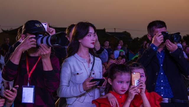 摄影爱好者端起自己手中的“长枪短炮”,共同记录下美丽动人的时刻,更多的观众则拿起手机,以小视频、照片等形式记录下一幅幅精彩的画面。图为两位摄影师之间,一位美女非常抢镜。