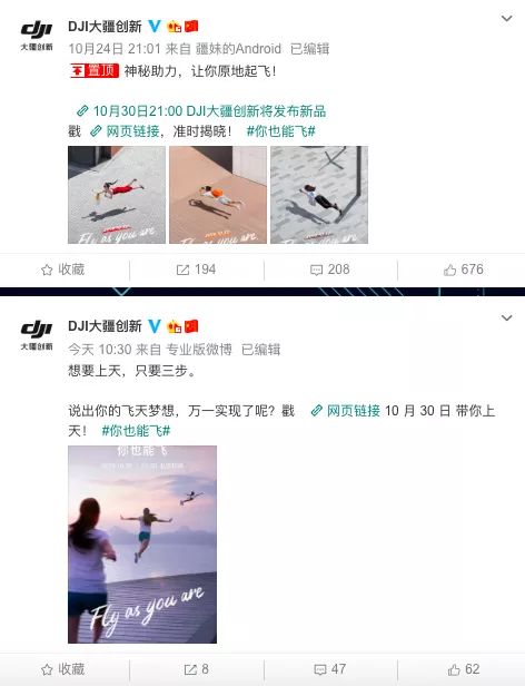ZAKER 新闻注意到,大疆两条微博的主题均围绕 " 起飞 " 和 " 上天 " 两个关键词,因此有不少网友猜测,此次的新品或与无人机有关。