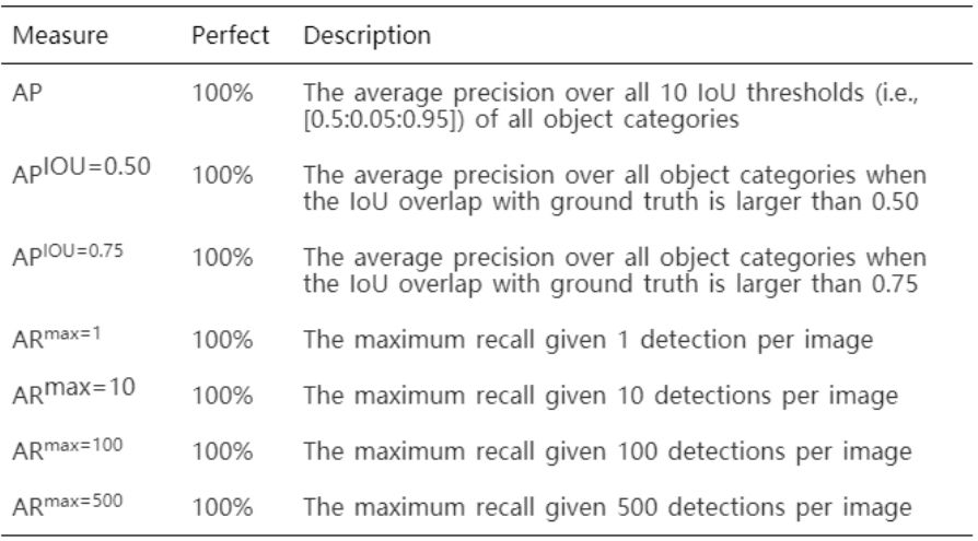 为了进行综合评估并反映每个对象类别的性能,本次测评采用类似于 MS COCO 数据集的评估方案,使用 AP, APIOU=0.50, APIOU=0.75, ARmax=1, ARmax=10, ARmax=100, 和 ARmax=500,且这些指标是基于 10 个对象类别计算出来的。