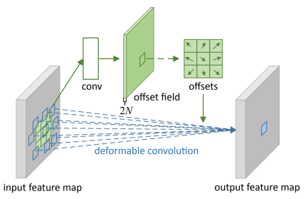 deformable convolution network 提出了「deformable convolution」和「deformable RoI pooling」两种网络结构单元,deformable convolution 和 deformable RoI pooling 都是基于通过学习一个额外的偏移(offset),使卷积核对输入 feature map 的采样产生偏移,集中于感兴趣的目标区域, 从而产生更好的感受野。