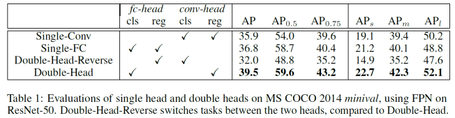 通过对比实验可发现:用 fc-head 去做分类,同时用 conv-head 去做回归,可以实现最好的效果。因为分类更多的需要语义信息,而回归坐标框需要更多的空间信息,这种方法采用「分而治之」的思想,针对不同的需求设计 head 结构,当然这种方法增加了计算量,在平衡速度和准确率的情况下,最后选择了 3 残差、2non-local,共 5 个模块。