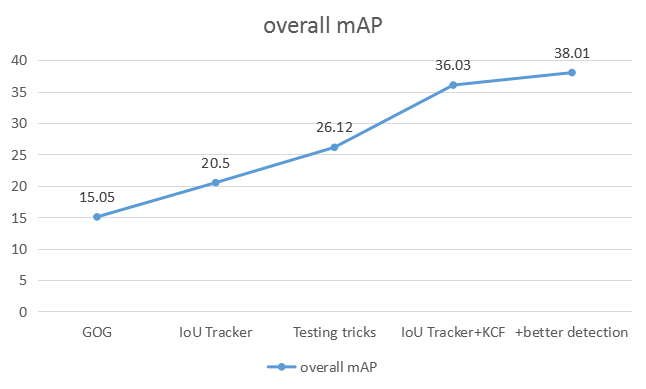 难点:使用 iou tracker 之后,还是会不可避免地遇到断帧 (一条轨迹无法全部预测,被预测为多个子段) 的问题,这样会大大降低最后的得分,所以我们使用 KCF 对现有结果进行一个更新。