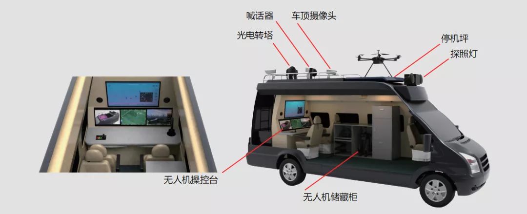无人机指挥车可装备大、中、小三款不同型号无人机,且无人机具有自动起降功能,可在车辆移动过程中进行收放,给执行任务带来极大便利;此外,指挥车、固定停机坪与远程指挥中心可实现信息共享、互联互通;通过无人机挂载双光/单光红外云台、4K相机、喊话器、投放器等不同载荷,迅速到达现场,将现场情况即时反馈,高效执行任务。