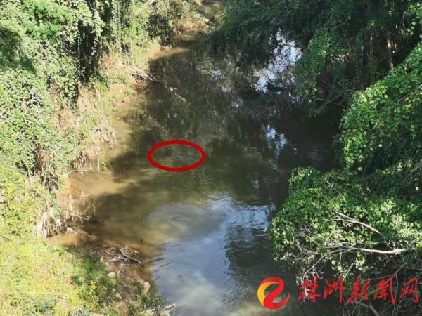 无人机正在巡河。图中红圈处为无人机。(赖杰琦 摄)