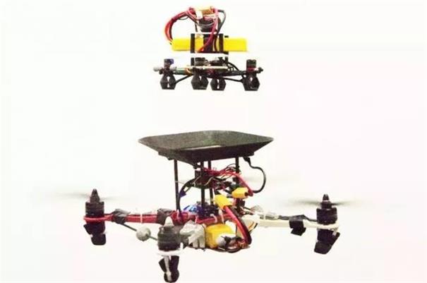 (照片:加州大学伯克利分校,飞行中的电池降落在主无人机顶部安装的托盘上,并将其支脚与电气触点对齐)
